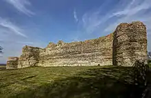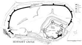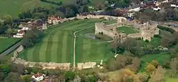 ![]() Vista aérea do Castelo de Pevensey, mostrando o colherão normando mantido dentro da cortina romana | |