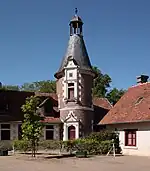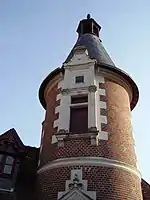 Porque a torre em si mesma data do século XIX - realizada segundo o modelo da torre da ala Luís XII do Château de Blois - imita nomeadamente as redes de tijolos vermelhos e negros.