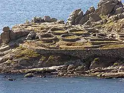 O setor seguinte está separado por um muro, que talvez serviria para conter a terra, e passa-se por ele subindo escadas, as melhor conservadas dos castros galegos. Distinguem-se um "bairro" de casas que delimita uma "praça" protegida do vento.