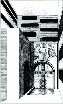 Nas paredes do fundo estão afrescos do "Batismo de Cristo", com figuras de João Batista, do Espírito Santo no formato de uma pomba, de uma corça bebendo água e de um anjo. Abaixo está pintada uma cruz gemada da qual despontam rosas. Na parede da esquerda está pintada a "Coroação de Abdon e Sennen", com os dois mártires, com as mãos levantadas ao céu e flanqueados por Mílex e Vincenzo, recebem de Cristo a coroa do martírio. Na abóbada da escada que leva até a piscina estão afrescadas duas imagens do "Pantocrator" em estilo típico da arte bizantina.