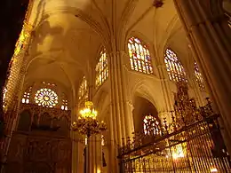 As catedrais de Burgos e Toledo estão inspiradas ambas na de Bourges da França; foram começadas ao mesmo tempo. Os seus dois promotores eram amigos e apoiavam a política de Fernando III. Toledo construiu-se mais devagar porque estava concebida com critérios mais ambiciosos: era a igreja do primado da Espanha. A redução efetuada em Burgos, respeito do modelo francês de Bourges, de três naves, deambulatório simples e transepto de uma nave, contrasta com a ampliação tipológica de Toledo, com cinco naves, duplo deambulatório e transepto de três naves.[33] Para construir Toledo foi derribada a mesquita, que estava em estado de ruína[34] e que pela sua vez fora construída sobre um templo cristão visigodo. Uma das características mais significativas da catedral de Toledo, e caso singular da arquitetura gótica europeia, é a forma de resolver a abóbada do deambulatório, que passa de cobrir 5 arcos na zona interior a 17 no muro exterior. A multiplicação das abóbadas para o exterior foi resolvida segundo o modelo de Le Mans, correspondendo a cada coluna interior duas exteriores. Em Toledo os dois deambulatórios bifurcam-se duas vezes.[35] Por último assinalar várias formas decorativas de inspiração islâmica empregadas em Toledo.[36]