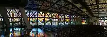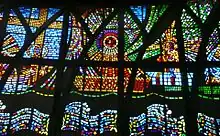Os vitrais trabalhados no concreto que contornam o espaço contam fatos históricos da Bíblia e a passagem de Cristo sobre a Terra. No altar encontra-se talhado em madeira a obra "Cristo rompendo a Cruz", de autoria de Godofredo Thaler. No lado oposto ao presbitério, a pequena torre abriga o confessionário.