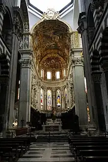 Vários altares e capelas foram erguidos entre os séculos 14 e 15. A pequena loggia na torre nordeste da fachada foi construída em 1455; o oposto, em estilo maneirista, é de 1522. Em 1550, o arquiteto peruano Galeazzo Alessi foi contratado pelos magistrados da cidade para planejar a reconstrução de todo o edifício; no entanto, executou apenas o revestimento da nave e corredores, o pavimento, a cúpula e a abside.