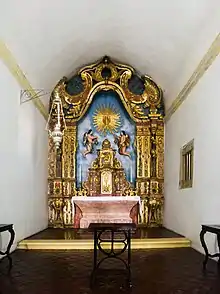 Na sacristia, à direita do templo, se preservam ainda uma grande bancada entalhada em jacarandá, pinturas e objetos de culto.