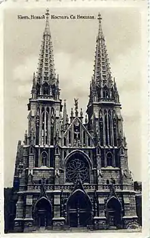 Um concurso foi realizado em 1898 para os projetos de uma Catedral Católica Romana em Kiev, que foi ganho pelo arquiteto S. Volovskiy. Sua entrada na competição incluiu uma construção do tipo gótico com duas torres de 60 metros. A revisão final e a gestão do projeto foram atribuídas ao arquiteto Kyivan Vladislav Gorodetsky, e Emilio Sala acrescentou decorações esculturais em pedra artificial para a construção. Para aumentar a estabilidade da construção no solo desigual de Kiev, a catedral foi assegurada por pilhas de furo e recheadas, uma invenção recém-introduzida de Anton Strauss.[1] Os trabalhos de construção foram realizados exclusivamente por doações voluntárias e duraram dez anos (entre 1899 e 1909).