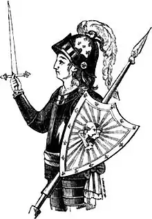 Estampa representando o sinal de reconhecimento dos cavaleiros do Punhal, na Jornada de 10 de Agosto de 1792, nas Tulherias. Ela foi gravada sobre um modelo ensanguentado achado sobre Villers, um dos Cavaleiros do Punhal, morto durante a jornada.