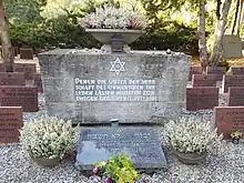 O memorial para as vítimas judaicas do regime nazista foi construído em 1960 por Josef M. Lellek usando pedras da sinagoga destruída na Fasanenstraße. A pedra memorial de 2 m × 1 m × 1 m se assemelha a um sarcófago e mostra uma estrela de Davi. Tem a inscrição: "Para aqueles que tiveram que dar suas vidas sob o domínio do monstro pela memória eterna 1933-1945". Em 1984 uma urna com as cinzas das vítimas do campo de concentração de Auschwitz foi enterrada em frente ao memorial. Ao redor da pedra memorial há pequenas pedras sepulcrais vermelhas em um amplo círculo, que os sobreviventes do Holocausto ergueram para seus entes queridos mortos.