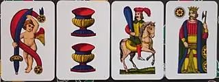![]() Cartas especiais no jogo Centocinque. Da esquerda para a direita: ás de espadas, dois de copas, cavalo de paus e rei de ouros. Cartas no padrão romanholo produzidas por Modiano. | |