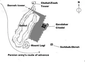 Durante a duração do cerco, houve poucas lutas já que as forças de Nader com bastante artilharia foram forçadas a realizar um bloqueio na cidade fortificada. Ficando cada vez mais impacientes, os persas realizaram vários ataques para tomar a cidade mas os afegãos conseguiram se defender desses ataques.[1]