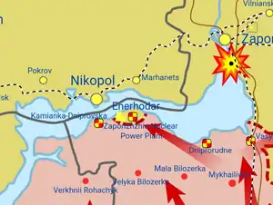 Em 28 de fevereiro de 2022 às 08:00 (UTC+2), as forças russas tentaram entrar na cidade de Enerhodar, mas enfrentaram resistência do exército ucraniano e das milícias de cidadãos.[1][2] Os combates duraram cerca de 2 horas até que, alega-se, 2 veículos autônomos russos foram destruídos pelas forças terrestres ucranianas. O Ministério da Defesa russo anunciou que capturou a cidade de Enerhodar e a Usina Nuclear de Zaporizhia. Cidadãos locais barricaram o caminho para a usina e a entrada da cidade, forçando as forças russas a voltar.[3] O prefeito de Enerhodar, Dmitri Orlov, negou que a cidade e a usina tenham sido capturadas.[4][5]