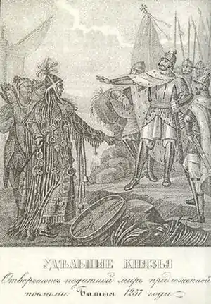 ![]() O príncipe do Ryazã rejeita a exigência de tributo dos mongóis. | |||