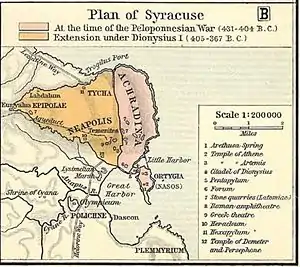![]() Plano da cidade de Siracusa na época do cerco. | |||