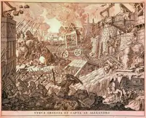 Em 332 a.C., Alexandre, o Grande tentou conquistar Tiro, uma base estratégica costeira na guerra entre os gregos e os persas. Como não conseguiu invadir a cidade, cercou Tiro durante sete meses, mas Tiro resistiu. Alexandre usou os destroços da cidade abandonada do continente para construir uma ponte, e, quando chegou suficientemente próximo das muralhas, usou as suas máquinas de cerco para atingir e posteriormente abrir brechas nas fortificações. Consta que Alexandre ficou de tal forma furioso com a resistência dos habitantes de Tiro e com a perda dos seus homens que destruiu meia cidade. De acordo com Arriano, Tiro teve cerca de 8000 baixas enquanto que os macedónios perderam 400 guerreiros. Alexandre concedeu o perdão ao rei e família, e os 30.000 residentes e estrangeiros foram feitos escravos.