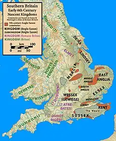 A história do período sub-romano na Britânia é parcamente referida e está sujeita importantes desacordos entre historiadores. Ao que parece, contudo, os raides do século V na Britânia por povos continentais transformaram-se em migrações. Os recém-chegados eram anglos, saxões, jutos e frísios. Capturaram territórios no leste e sul da Britânia, mas perto do fim do século V, uma vitória britânica na Batalha do Monte Badonico parou o avanço anglo-saxão por 50 anos.[1][2] Perto do ano 550, contudo, os britanos voltaram a perder terreno, e dentro de 25 anos, parece que quase todo o sul da ilha estava sob os invasores.[3]