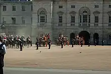 Após o discurso, o monarca e seu séquito deixam a câmara. O monarca se inclina para os dois lados da Casa dos Pares e depois sai da câmara, na ordem inversa da procissão usual, antes que os Comuns se curvem novamente e retornem à sua Câmara.
