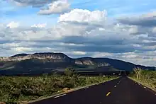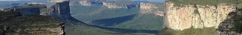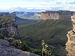 A Chapada Diamantina é uma região de serras, situada no centro do estado brasileiro da Bahia, parte de uma vasta cordilheira conhecida por Cadeia do Espinhaço[nota 2] "(...) é um extenso planalto (38 000 km²), que corresponde a 15% do Estado da Bahia"[2][nota 3] Nela nascem quase todos os rios das bacias do Paraguaçu, do Jacuípe e do Rio de Contas. Ali estão as maiores altitudes da Região Nordeste do Brasil: o Pico do Barbado, com 2 033 metros, Pico do Itobira e o Pico das Almas.[3][4] A formação geográfica faz parte do conjunto de serras e planaltos do Leste e do Sudeste do relevo brasileiro e constitui-se como prolongamento da Serra do Espinhaço, portanto, é um escudo cristalino formado no Pré-Cambriano.[5][6] Em suas variadas paisagens, com ecossistemas que incluem a caatinga, cerrado, campos rupestres e até ilhas de mata atlântica, existem diversas áreas de proteção ambiental nas três esferas administrativas - federal, estadual e municipal, tais como o Parque Nacional da Chapada Diamantina, o Parque Estadual do Morro do Chapéu ou a Área de Proteção Ambiental Marimbus-Iraquara.