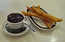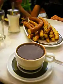 Denomina-se chocolate com churros um prato composto de chocolate quente (geralmente entre 75 °C e 80 °C) servido em uma xícara de porcelana acompanhado de um prato de churros frescos (geralmente uma porção contém de seis a oito, dependendo do tamanho). Dependendo do local onde é servido, pode ser acompanhado um prato de açúcar, para polvilhar nos churros e uma jarra de água fria, a fim de abrandar a sede, devido ao sal dos churros.