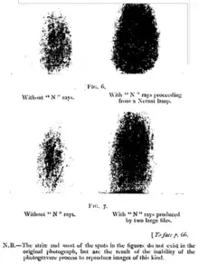 Em 1903, Prosper-René Blondlot estava trabalhando com raios X (como era o caso de muitos físicos da época) quando afirmou ter descoberto um novo tipo de radiação visível capaz de penetrar o alumínio, que batizou de raios N. Ele elaborou experimentos em que um objeto em quase total escuridão era iluminado por esses raios N, e que assim tornava-se "mais visível". Blondlot alegou que raios N estavam causando uma pequena reação visual, muito sutil para ser vista sob condições normais de iluminação, mas ligeiramente perceptível quando fontes normais de luz eram removidas.