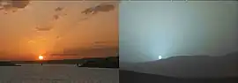 Comparação entre um pôr do sol na Terra em Marselha, França e um pôr do sol em Marte capturado pelo rover Curiosity na cratera Gale. As ciências físicas estudam determinados aspectos presente nesta imagem.
