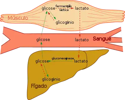 Este lactato acumula-se no tecido muscular e difunde-se posteriormente para a corrente sanguínea. Quando o esforço físico termina, o lactato é convertido a glicose através da gliconeogénese, no fígado. O indivíduo continua a ter uma respiração acelerada por algum tempo: o O2 extra consumido neste período promove a fosforilação oxidativa no fígado e, consequentemente, uma produção elevada de ATP. O ATP é necessário para a gliconeogénese, formando-se então a glicose a partir do lactato, e esta glicose é transportada de volta aos músculos para armazenamento sob a forma de glicogénio.