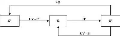 Da mesma maneira acontece a destruição do ozônio, qual absorve radiação UV-B e libera novamente moléculas diatômicas e atômicas. Funcionando como um ciclo, chamado de ciclo de Chapman.[2]