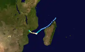 Em 23 de fevereiro, a agência da Météo-France na ilha de Reunião (MFR) começou a rastrear uma depressão tropical no nordeste de Madagáscar.[1] Nessa época, a depressão desenvolveu uma circulação fechada, que recebeu uma avaliação de T1.5 na Escala de Dvorak, uma ferramenta usada para estimar a intensidade de um sistema.[2] Pouco tempo depois, o Joint Typhoon Warning Center (JTWC) primeiro classificou o sistema, designando-o como 14S. Após um ligeiro aumento na organização,[2] a depressão mudou-se para sudoeste e cruzou rapidamente a ponta norte de Madagáscar.[3] Depois de enfraquecer sobre a terra,[2] a depressão reentrou no canal de Moçambique perto de Analalava em 25 de fevereiro.[4][nb 1] Com base em uma classificação Dvorak 3.0, o MFR atualizou a tempestade em tempestade tropical moderada em 27 de fevereiro;[2] o JTWC seguiria o exemplo mais tarde naquele dia.[6]