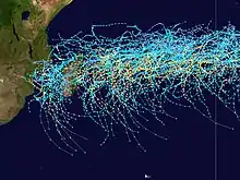 Desde a temporada de ciclones no sudoeste do Oceano Índico (1980-81) até a temporada de ciclones no sudoeste do Oceano Índico (2010-11), houve uma média de 9,3 tempestades tropicais a cada ano na bacia. Uma tempestade tropical tem ventos de pelo menos 65 km/h. Há uma média de cinco tempestades que se tornam ciclones tropicais, com ventos máximos sustentados de pelo menos 120 km/h.[9] Em 2002, havia uma média de 54 dias quando os sistemas tropicais estavam ativos na bacia, dos quais 20 estavam ativos, ou um sistema com ventos superiores a 120 km/h. A data mediana de início da temporada foi 17 de novembro, e a data mediana de fim foi 20 de abril.[1]