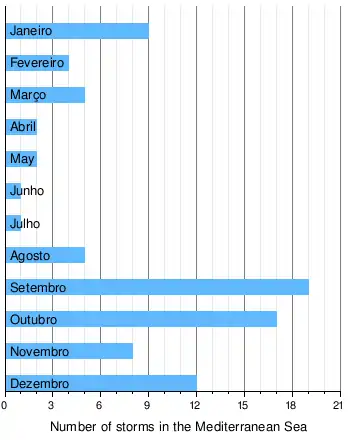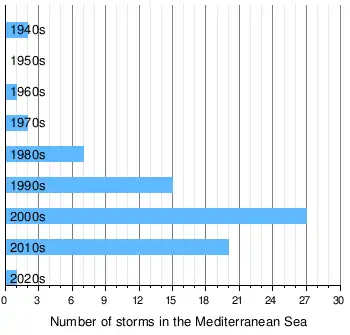 A ocorrência de Medicanes foi descrita como não particularmente rara.[2] Os sistemas semelhantes aos tropicais foram identificados pela primeira vez na bacia do Mediterrâneo na década de 1980, quando uma ampla cobertura de satélite mostrando baixas pressões de aparência tropical que formava um olho ciclônico no centro foi identificada.[3] Devido à natureza seca da região do Mediterrâneo, a formação de ciclones tropicais e subtropicais é rara e também difícil de detectar, em particular com a reanálise de dados anteriores. Dependendo dos algoritmos de busca usados, diferentes levantamentos de longo prazo da era do satélite e dados da era pré-satélite resultaram em 67 ciclones tropicais de intensidade de tempestade tropical ou superior entre 1947-2014,[4] e cerca de 100 tempestades tropicais registadas entre 1947 e 2011.[5] Existe mais consenso sobre a distribuição temporal e espacial de longo prazo dos ciclones tropicais: eles se formam predominantemente sobre o oeste e centro do Mar Mediterrâneo, enquanto a área a leste de Creta é quase desprovida de ciclones tropicais.[4][5] O desenvolvimento de ciclones tropicais pode ocorrer durante todo o ano, com pico de atividade historicamente entre os meses de setembro e janeiro, enquanto as contagens para os meses de verão de junho e julho são as mais baixas.[4][5][6]