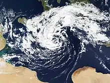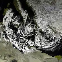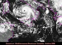 Em 1996 desenvolveram-se três notáveis medicanes. A primeira, em meados de setembro de 1996, foi um ciclone tropical típico do Mediterrâneo que se desenvolveu na região das Ilhas Baleares.[73] Na época da formação do ciclone, uma poderosa frente fria do Atlântico e uma frente quente associada a uma baixa em grande escala, produzindo ventos de nordeste sobre a Península Ibérica, estendeu-se para o leste no Mediterrâneo, enquanto a humidade abundante se acumulou na baixa troposfera sobre as Baleares canal.[74] Na manhã de 12 de setembro, um distúrbio desenvolveu-se ao largo de Valência, Espanha, causando fortes chuvas na costa, mesmo sem chegar à costa. Um olho se desenvolveu pouco depois, à medida que o sistema atravessou rapidamente Maiorca e Sardenha em sua jornada para o leste. Ele atingiu a costa do sul da Itália na noite de 13 de Setembro com pressão atmosférica mínima de 990 mbar (29,24 inHg), dissipando-se logo após chegar à costa,[75] com um diâmetro de cerca de 150 km (93 mi).[50]