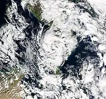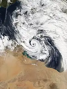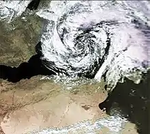 A incomum tempestade tropical mediterrânea de janeiro de 1982, apelidado de Leucosia, foi detectado pela primeira vez em águas ao norte da Líbia.[55] A tempestade provavelmente atingiu a cordilheira do Atlas como uma área de baixa pressão em 23 de Janeiro de 1982 , reforçado por um vale alongado e vagaroso acima da Península Ibérica. Eventualmente, um centro de circulação fechado desenvolvido às 13:10 UTC,[58] sobre partes do Mediterrâneo com temperaturas da superfície do mar (SSTs) de aproximadamente 16 °C (61 °F) e temperatura do ar de 12 °C (54 °F).[59] Uma nuvem em forma de gancho se desenvolveu dentro do sistema logo em seguida, girando conforme se alongava em 150 km (93 mi) -aparelho em forma de vírgula longa. Depois de contornar a Sicília, ele se desviou para o leste entre a ilha e o Peloponeso , recurvando em sua trilha novamente,[60] exibindo bandas espirais claramente curvas antes de encolher ligeiramente.[61] O ciclone atingiu seu pico de intensidade em 1800 UTC do dia seguinte, mantendo pressão atmosférica de 992 mbar (29,30 inHg ), e foi sucedido por um período de enfraquecimento gradual, com a pressão do sistema finalmente aumentando para 1009 mbar (29,80 inHg). O sistema foi ligeiramente reintensificado, no entanto, por um período de seis horas no dia 26 de Janeiro. Relatórios de navios indicaram ventos de 93 km/h (57,7 mph ou 50,2 kt) estavam presentes no ciclone na época, ventos com força de tempestade tropical na escala de vento do furacão Saffir-Simpson,[58] provavelmente perto da parede do olho do ciclone, que apresenta os ventos mais fortes em um ciclone tropical.[59]