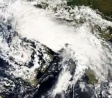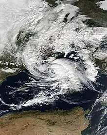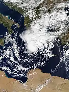 Rajadas de vento ultrapassando 144 km/h (89 mph) foram registados quando passou sobre Salento devido a um gradiente de pressão acentuado associado a ele, confirmado por observações de radar regionais que denotam a presença de um olho claro.[80] Os ventos fortes infligiram danos moderados em toda a península, embora danos específicos sejam desconhecidos.[73] Cerca de 10:00 UTC, o radar e o satélite registaram a entrada do sistema no Mar Adriático e sua curva gradual para noroeste em direção à costa italiana. Por volta de 1700 UTC, o ciclone atingiu o norte da Apúlia, mantendo sua intensidade, com uma pressão atmosférica mínima em 988 mbar (29,18 inHg). O ciclone enfraqueceu enquanto se deslocava mais para o interior sobre o continente italiano, eventualmente se dissipando conforme fazia uma curva para oeste-sudoeste. Um estudo posterior em 2008 avaliou que o ciclone possuía inúmeras características vistas em ciclones tropicais em outros lugares, com uma aparência em espiral, aparato semelhante a um olho, rápidas diminuições da pressão atmosférica antes do desembarque e ventos intensos sustentados, concentrados perto da parede do olho da tempestade;[81][82] a aparente estrutura semelhante a um olho no ciclone, entretanto, estava mal definida.[72] Desde então, o medicane tem sido objeto de importantes estudos em decorrência da disponibilidade de observações científicas e relatórios relacionados ao ciclone.[80] Em particular, foram analisados a sensibilidade deste ciclone às temperaturas da superfície do mar,[83] as condições iniciais, o modelo[84] e os esquemas de parametrização usados nas simulações.[85] Também foi estudada a relevância de diferentes índices de instabilidade para o diagnóstico e a previsão desses eventos.[86]