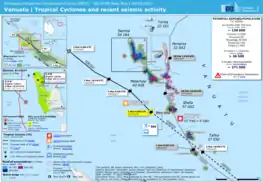 Como o ciclone Kevin estava impactando a nação em 3 de março, o sismo de 6,5 M atingiu a oeste do Espírito Santo a uma profundidade de 10 km (6.2 mi). O terremoto teve uma intensidade máxima de Mercalli Modificada de VI, indicando fortes condições de agitação.[74][83] O Centro de Alerta de Tsunami do Pacífico indicou que não há risco de tsunami.[84] Um tremor secundário de terremoto de magnitude 5,5 atingiu a ilha logo depois.[85]