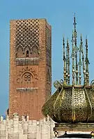 ![]() A Torre Hassan, nas ruínas da mesquita almóada com o mesmo nome, em Rabate |