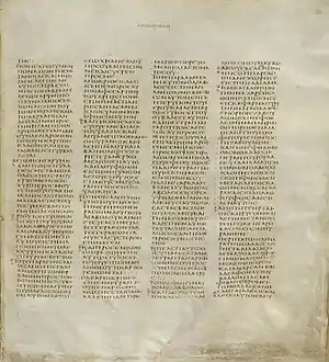 - "O texto foi escrito em três ou quatro colunas [por página]" (Tischendorf, Gebhardt, Gregory, Kirsopp Lake);