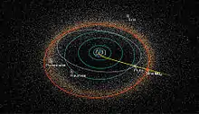 O cinturão de Kuiper recebeu o nome do astrônomo holandês Gerard Kuiper, embora ele não tenha previsto sua existência. Em 1992, o planeta menor (15760) Albion foi descoberto, o primeiro objeto do cinturão de Kuiper (KBO) desde Plutão (em 1930) e Caronte (em 1978).[10] Desde a sua descoberta, o número de KBOs conhecidos aumentou para milhares, e acredita-se que existam mais de 100 000 KBOs com mais de 100 km de diâmetro.[11] O cinturão de Kuiper foi inicialmente pensado para ser o principal repositório de cometas periódicos, aqueles com órbitas com duração inferior a 200 anos. Estudos desde meados da década de 1990 mostraram que o cinturão é dinamicamente estável e que o verdadeiro local de origem dos cometas é o disco disperso, uma zona dinamicamente ativa criada pelo movimento externo de Netuno há 4,5 bilhões de anos;[12] objetos de disco disperso como como Éris têm órbitas extremamente excêntricas que as levam até 100 UA do Sol.[lower-alpha 1]