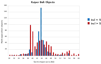 O cinturão de Kuiper clássico parece ser um composto de duas populações separadas. A primeira, conhecida como população "dinamicamente fria", tem órbitas muito parecidas com os planetas; quase circulares, com uma excentricidade orbital inferior a 0,1 e com inclinações relativamente baixas de até cerca de 10° (elas ficam próximas ao plano do Sistema Solar e não em um ângulo). A população fria também contém uma concentração de objetos, referidos como kernel, com semieixo maiores em 44 a 44,5 UA.[45] A segunda, a população "dinamicamente quente", tem órbitas muito mais inclinadas em relação à eclíptica, em até 30°. As duas populações receberam esse nome não por causa de qualquer grande diferença de temperatura, mas por analogia com as partículas de um gás, que aumentam sua velocidade relativa à medida que são aquecidas.[46] Não são apenas as duas populações em órbitas diferentes, a população fria também difere em cor e albedo, sendo mais vermelha e mais brilhante, tem uma fração maior de objetos binários,[47] tem uma distribuição de tamanho diferente,[48] e carece de objetos muito grandes.[49] A massa da população dinamicamente fria é aproximadamente 30 vezes menor que a massa da quente.[48] A diferença de cores pode ser um reflexo de diferentes composições, o que sugere que elas se formaram em diferentes regiões. Supõe-se que a população quente tenha se formado perto da órbita original de Netuno e tenha se espalhado durante a migração dos planetas gigantes.[3][50] A população fria, por outro lado, foi proposta como tendo se formado mais ou menos em sua posição atual porque é improvável que os binários soltos sobrevivam aos encontros com Netuno.[51] Embora o modelo de Nice pareça ser capaz de explicar pelo menos parcialmente uma diferença de composição, também foi sugerido que a diferença de cor pode refletir diferenças na evolução da superfície.[52]