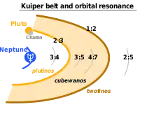 Quando o período orbital de um objeto é uma proporção exata de Netuno (uma situação chamada ressonância de movimento médio), ele pode ficar travado em um movimento sincronizado com Netuno e evitar ser perturbado se seus alinhamentos relativos forem apropriados. Se, por exemplo, um objeto orbita o Sol duas vezes para cada três órbitas de Netuno, e se atinge o periélio com Netuno a um quarto de órbita dele, sempre que retornar ao periélio, Netuno estará sempre na mesma posição relativa como começou, porque terá completado 1+1⁄2 órbitas ao mesmo tempo. Isso é conhecido como ressonância 2:3 (ou 3:2) e corresponde a um semieixo maior característico de cerca de 39,4 UA. Esta ressonância 2:3 é preenchida por cerca de 200 objetos conhecidos,[53] incluindo Plutão e suas luas. Em reconhecimento a isso, os membros dessa família são conhecidos como plutinos. Muitos plutinos, incluindo Plutão, têm órbitas que cruzam a de Netuno, embora sua ressonância signifique que eles nunca podem colidir. Os plutinos têm altas excentricidades orbitais, sugerindo que eles não são nativos de suas posições atuais, mas foram jogados ao acaso em suas órbitas pela migração de Netuno.[54] As diretrizes da União Astronômica Internacional determinam que todos os plutinos devem, como Plutão, receber nomes de divindades do submundo.[44] A ressonância 1:2 (cujos objetos completam meia órbita para cada um de Netuno) corresponde a semieixo maiores de ~47.7 UA e é pouco povoada.[55] Seus residentes às vezes são chamados de twotinos. Outras ressonâncias também existem em 3:4, 3:5, 4:7 e 2:5.[20](p104) Netuno tem vários objetos troianos, que ocupam seus pontos lagrangeanos, regiões gravitacionalmente estáveis que o conduzem e seguem em sua órbita. Os troianos de Netuno estão em ressonância de movimento médio de 1:1 com Netuno e geralmente têm órbitas muito estáveis.