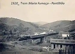 Trem sobre o pontilhão no atual centro de Alto Jequitibá (próximo à "Rua dos Gripp") em 1920.