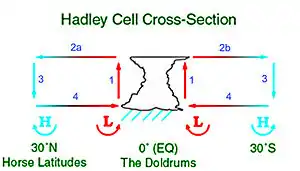 A circulação de Hadley se origina pelo transporte de calor desde as zonas equatoriais até as latitudes médias, onde a quantidade de radiação solar incidente é normalmente muito menor. As células de Hadley estendem-se desde o equador até latitudes de aproximadamente 30º, em ambos os hemisférios. Este calor é transportado em um movimento celular, com o ar ascendendo por convecção nas regiões equatoriais e deslocando-se até as latitudes superiores, pelas camadas atmosféricas mais altas. A subida do ar quente no equador está acompanhada pela formação frequente de tempestades convectivas na chamada Zona de Convergência Intertropical.