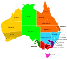 Mapa das Dioceses Católicas da Austrália, colorido por província eclesiástica e arquidiocese. Os nomes das dioceses são os nomes ingleses nativos.