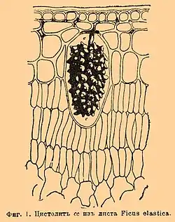 - Watt, W.M.; Morrell, C.K.; Smith, D.L.; Steer, M.W. (1987). «Cystolith development and structure in Pilea cadierei (Urticaceae)». Annals of Botany. 60 (1): 71–84. doi:10.1093/oxfordjournals.aob.a087424