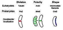 Elementos do citoesqueleto do Caulobacter crescentus. Os elementos citoesqueléticos procarióticos são associados aos seus homólogos eucarióticos e à função celular hipotetizada.[1]