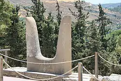 Em suas escavações em Cnossos, Evans descobriu quase mil tabuinhas, completas ou fragmentadas contendo escrita até então desconhecida.[167] Em seu livro Scripta Minoa, Arthur Evans tentou unir estes hieróglifos. Contou 135,[168] mas seu número total é maior, uma vez que nem todos foram catalogados por ele. No entanto, ele conseguiu distinguir duas fases na evolução destes hieróglifos, e descobriu que sua utilização foi generalizada em Creta.[169] A primeira fase foi marcada por selos com ideogramas do pré-palaciano e protopalaciano. A segunda fase é caracterizada pela incisão meticulosa e caligráfica dos sinais; tal fase durou até cerca de 1 700 a.C., quando passou a configurar apenas textos rituais.[166] Sobre este ponto, as teorias são de que a escrita hieroglífica, originalmente derivada de formas naturais, seria convertida em um talismã usado no final do minoano antigo.[170] Foram encontrados selos com inscrições hieroglíficas datados do Minoano Médio, inclusivamente alguns em edifícios de Cnossos destruídos em 1 450 a.C. Também foram descobertas versões simplificadas desses hieróglifos, adotando uma escrita linear, assim como uma espécie de grafites nas paredes de Cnossos e Agia Triada, a partir de 1 700 a.C.[171][172]