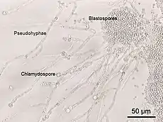 Os clamidósporos são, usualmente, escuros, esféricos e possuem uma superfície lisa, não ornamentada. Eles são multicelulares, sendo as células conectadas por septos.