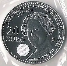 Em 2011, por ocasião do centenário do Dia Internacional da Mulher, a Fábrica Nacional da Moeda e Timbre cunhou a moeda comemorativa em prata com o valor facial de 20 euros que mostra a efígie de Clara Campoamor.[17] Nesse mesmo ano de 2011, uma escultura em tamanho natural da artista Dora Salazar representando Clara Campoamor, de pé com um livro nas mãos, foi colocada na praça Clara Campoamor em San Sebastián, Guipúscoa. Em 2017, a escultura foi transferida para a Plaza Vinuesa Central.[18]
