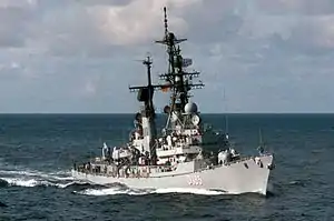 | Armamento | 2 x canhões de 127 mm (5,00 in) 2 x canhões de 20 mm (0,787 in) 1 x lançador modificado Mark 13 32 x mísseis terra-ar SM-1MR 8 x mísseis anti-navio AGM-84 Harpoon 2 x lançadores Mk 49 com 21 mísseis terra-ar RAM 6 x tubos lançadores de torpedos de 324 mm (12,8 in) 1 x lançador ASROC com 8 células |