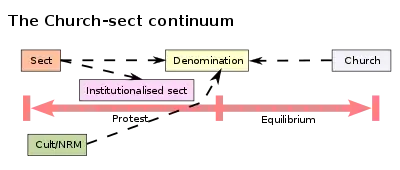 A tipologia igreja-seita foi enriquecida com subtipos. A teoria do "contínuo" (continuum) igreja-seita afirma que igrejas, eclésias, denominações e seitas formam um contÌnuo com influência decrescente na sociedade. As seitas são grupos dissidentes das religiões mais tradicionais e tendem a estar em tensão com a respectiva sociedade. Os cultos e os novos movimentos religiosos estão fora deste contìnuo e, em contraste com os grupos acima mencionados, muitas vezes têm um ensinamento novo. Eles foram classificados de acordo com sua atitude perante a sociedade e o nível de envolvimento de seus adeptos.