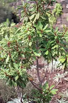 É uma pequena árvore perenifólia, que chega aos 10 metros de altura, com tronco recoberto por um ritidoma liso, castanho ou acinzentado. As folhas são oblanceoladas a obovadas, acuminadas, com até 20 centímetros de comprimento, serradas, glabras na página superior e pubescentes na inferior. O pecíolo é curto, avermelhado e pubescente.