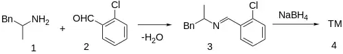 A condensação entre anfetamina (1) e 2-clorobenzaldeído (2) forma uma base de Schiff, CID:135056236 (3). Em seguida, a redução com borohidreto de sódio completa a síntese do clobenzorex (4).