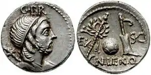 | Busto diademado do "Gênio do Povo Romano" com um cetro sobre o ombro; inscrição G•P•R acima. | Inscrição EX SC dividido ao meio por um cetro, um globo e um remo; inscrição CN•LEN•Q abaixo. |
